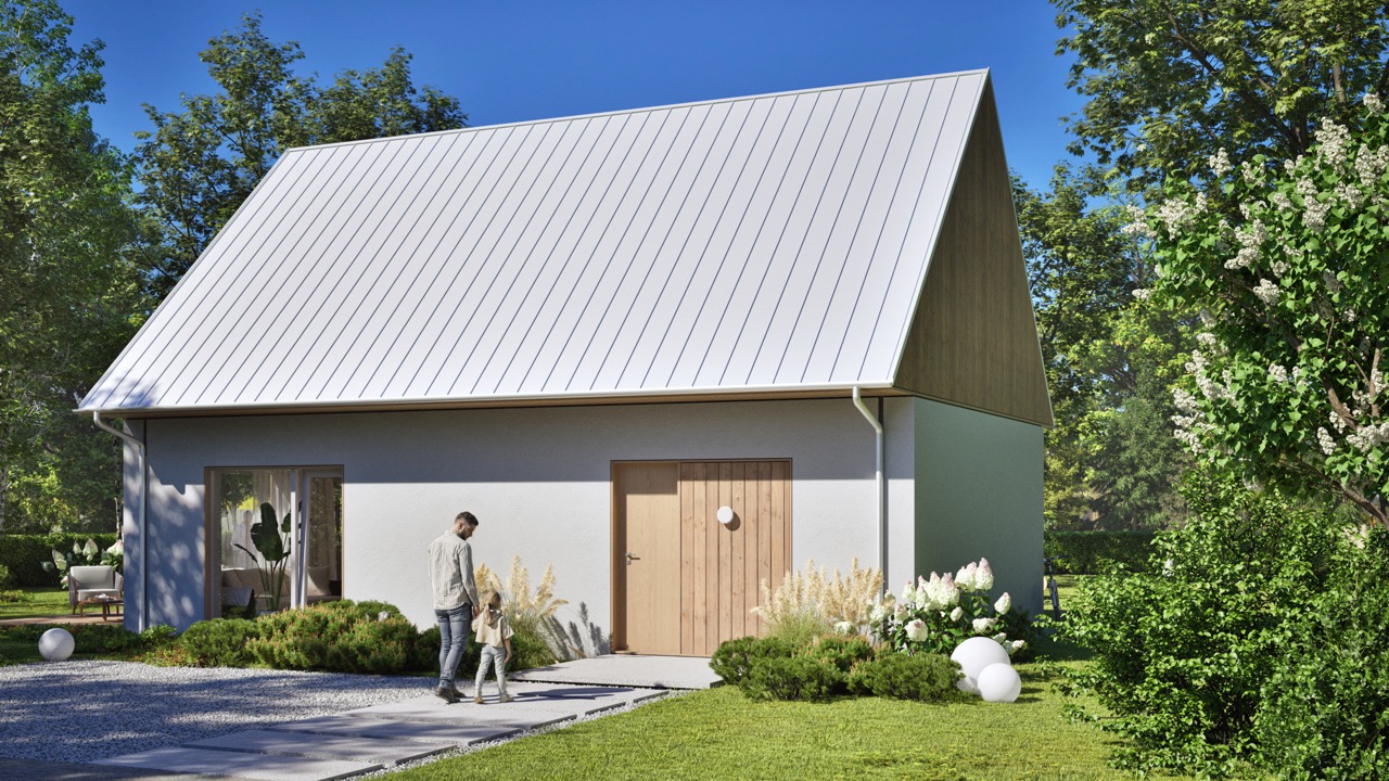 Dach dwuspadowy, kryty blachodachówką lub blachą na rąbek